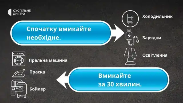 У ДТЕК радять після відновлення живлення спочатку підключати холодильник, освітлення та зарядки, а потужну техніку (бойлер, пральну, чайник, праску) — вмикати через 30 хвилин і по черзі, щоб не перевантажувати мережу та уникнути аварій.