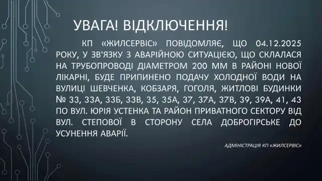 УВАГА! ВІДКЛЮЧЕННЯ ВОДОПОСТАЧАННЯ